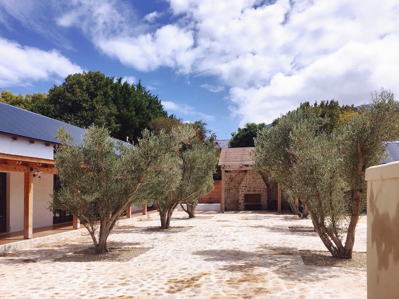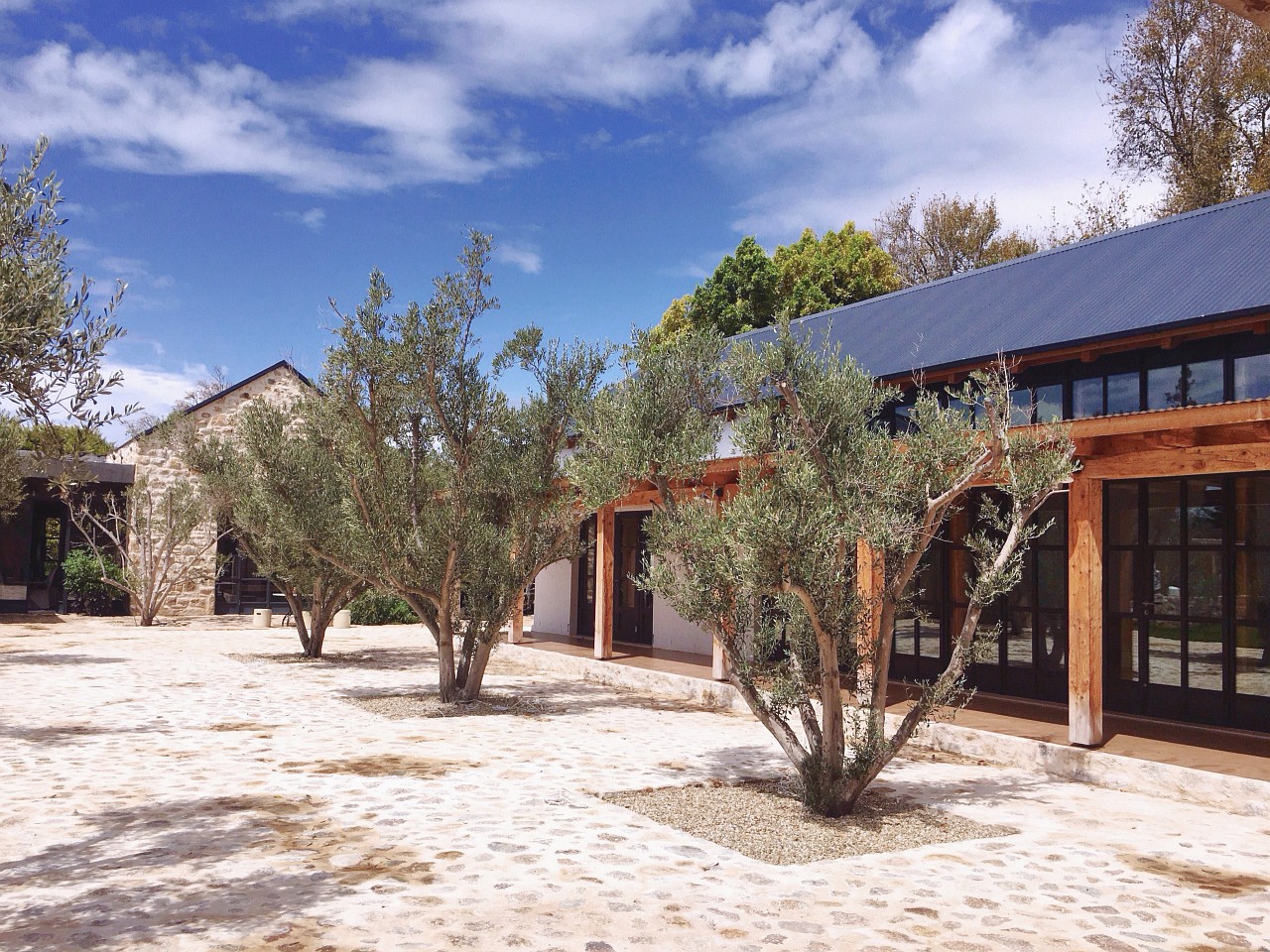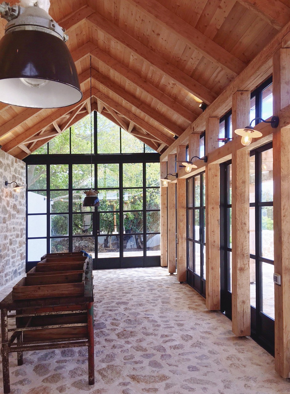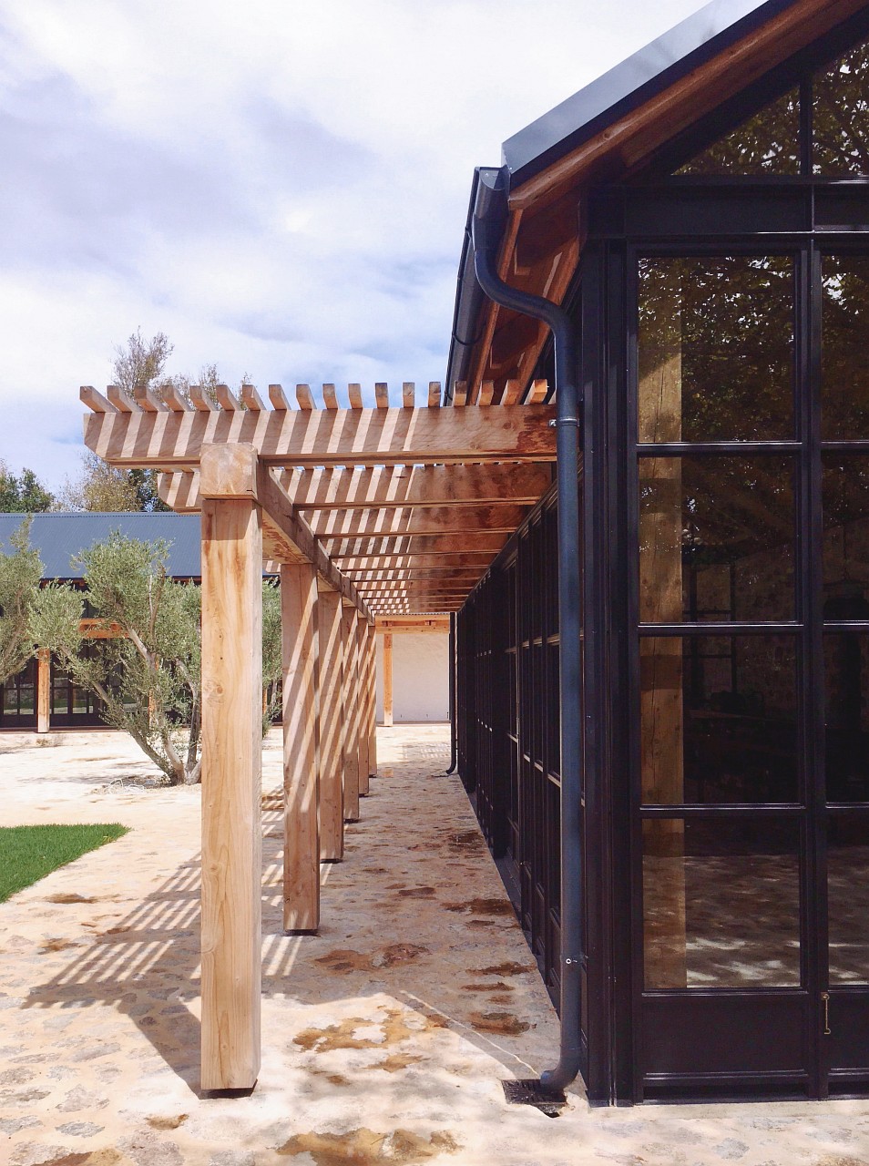 the olive court spans from the gazebo, across the front of the studio barn, to the main house beyond, where the garden walls have been removed to link directly to the new court.