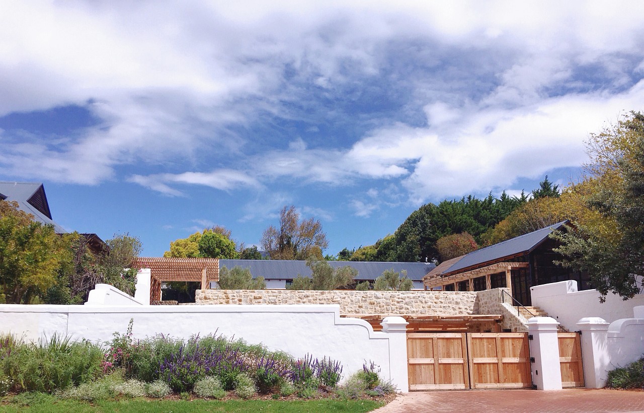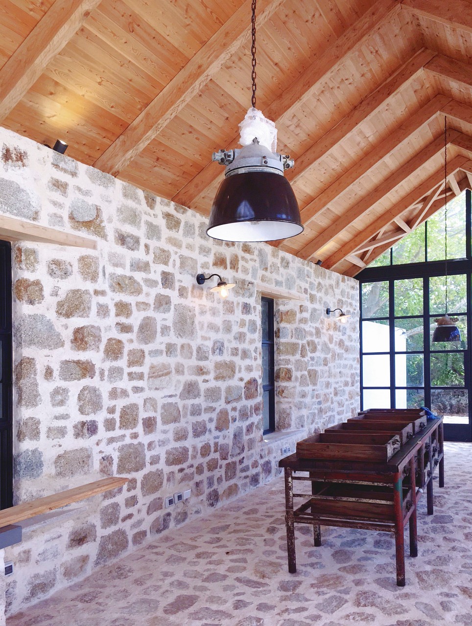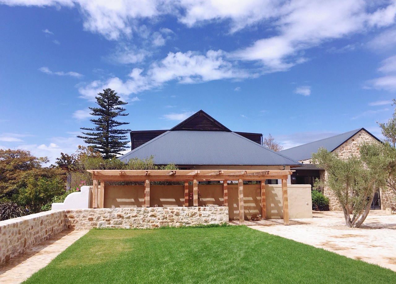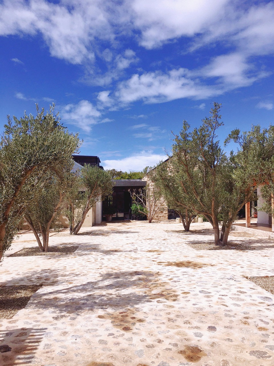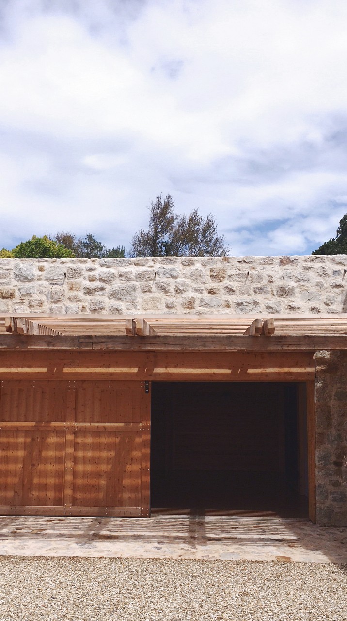 the olive court spans from the gazebo, across the front of the studio barn, to the main house beyond, where the garden walls have been removed to link directly to the new court.