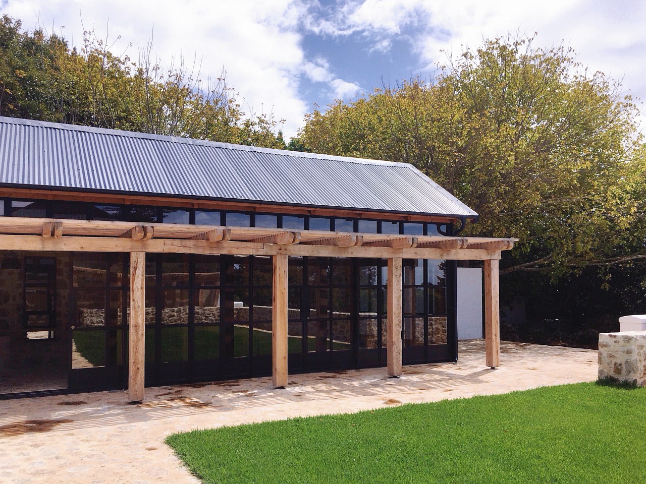 the green house has shading on the east + west, as the local climate doesn't necessitate heavy sunlight in the greenhouse