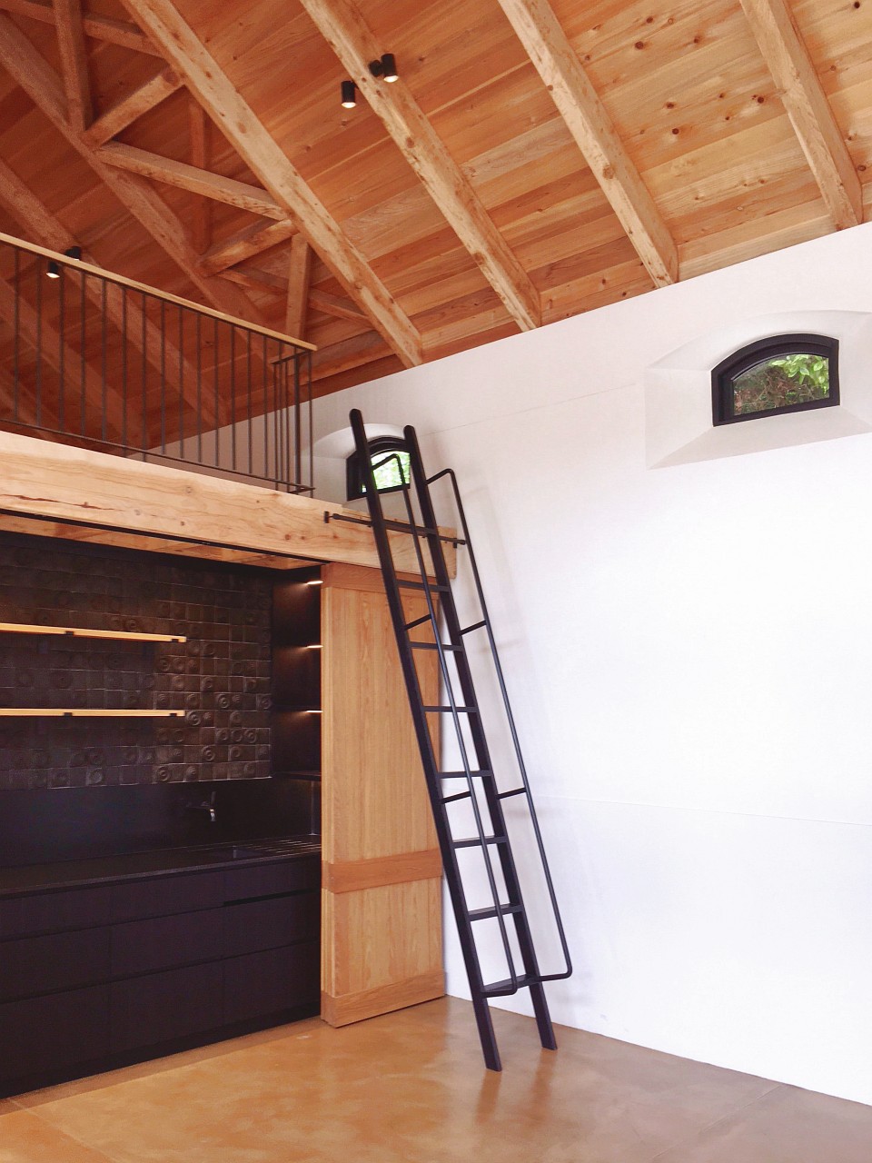 the kitchen can be closed off completely with the sliding panels that park under the ladder.