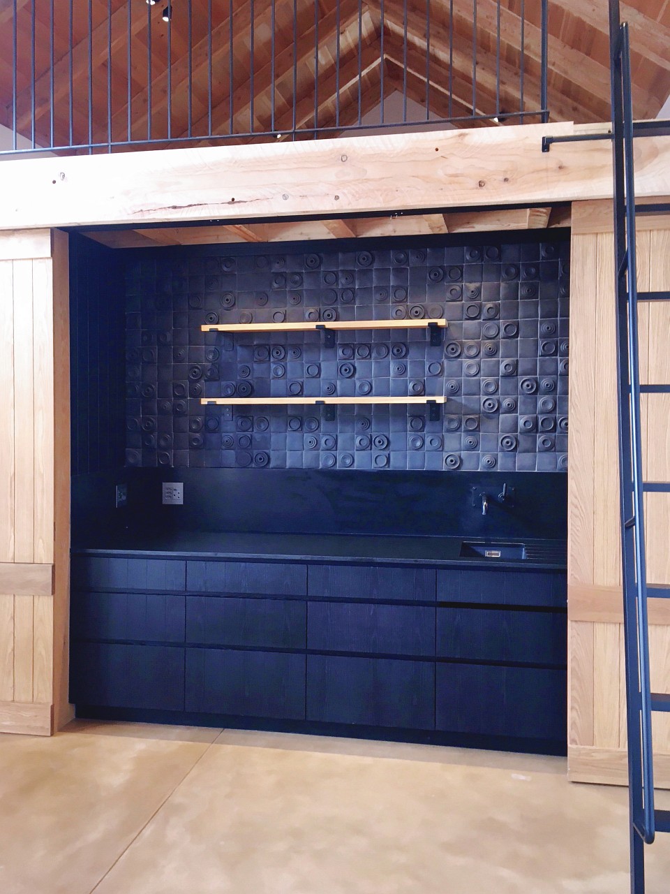 the small kitchen has a stone + handmade tile splash back + an adjacent integrated fridge matching the sliding panels