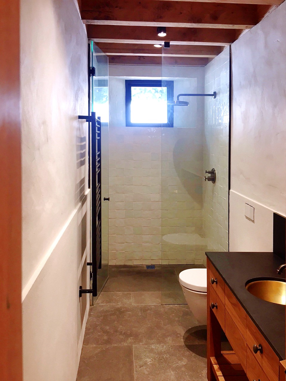 the small bathroom adjacent to the suite + studio has handmade tiles, natural stone floor + 'soft' rendered walls.