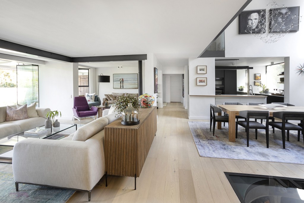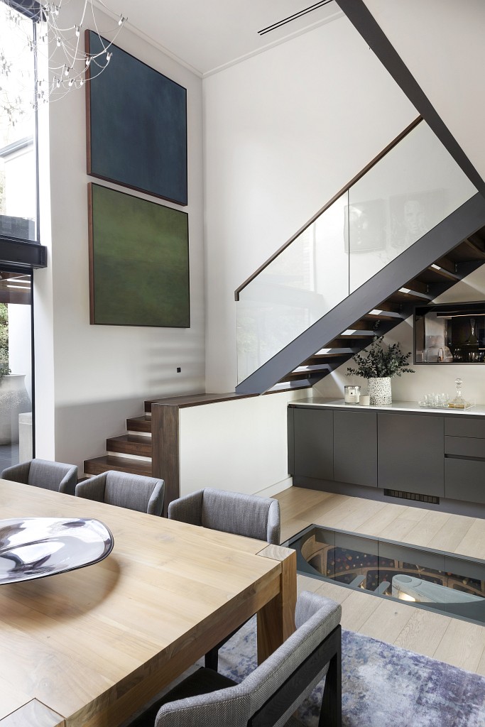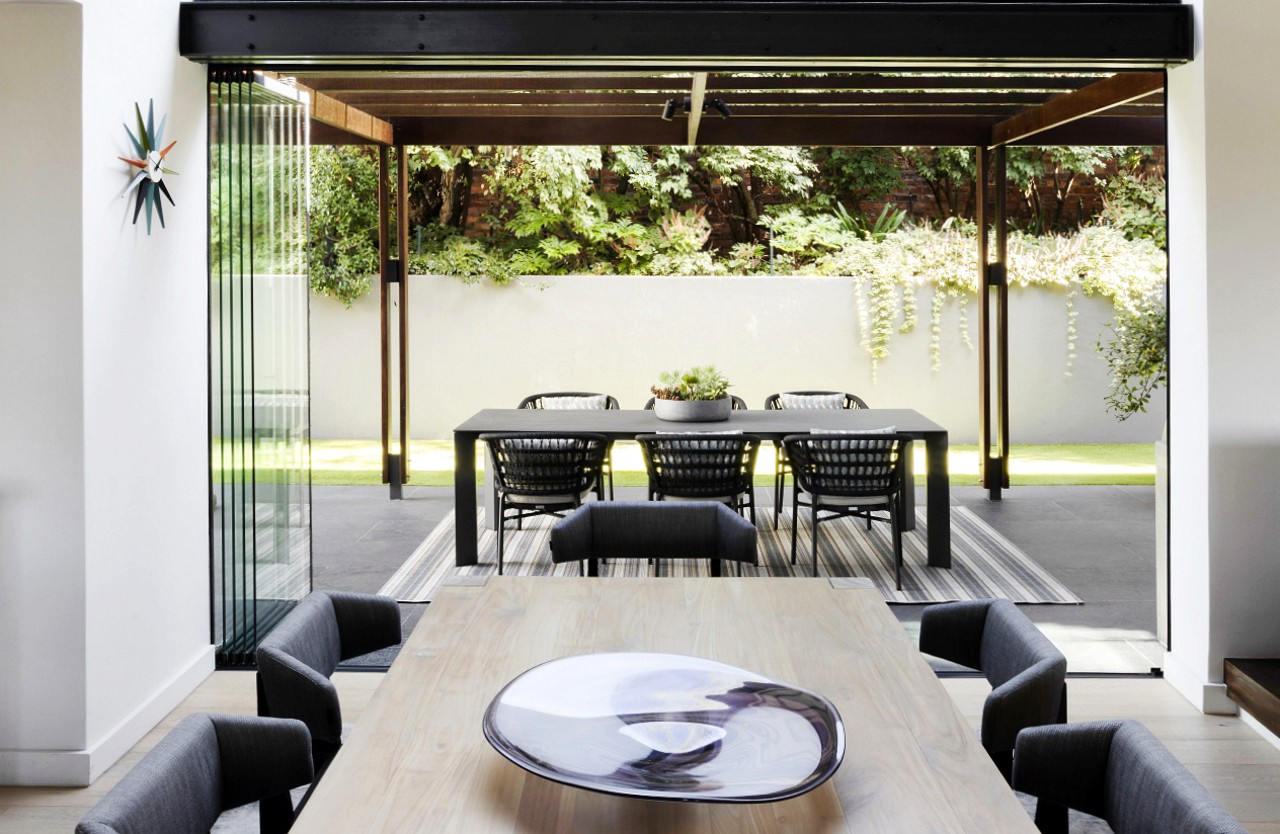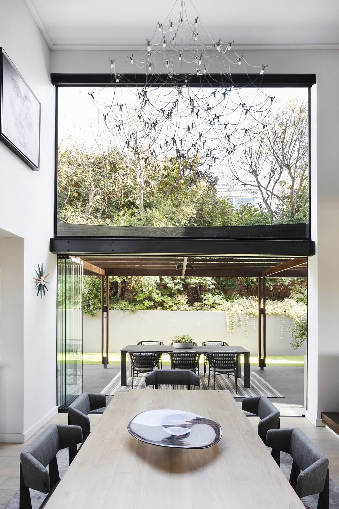 frameless glazed doors + double volume window onto rear garden + outside dining area.
