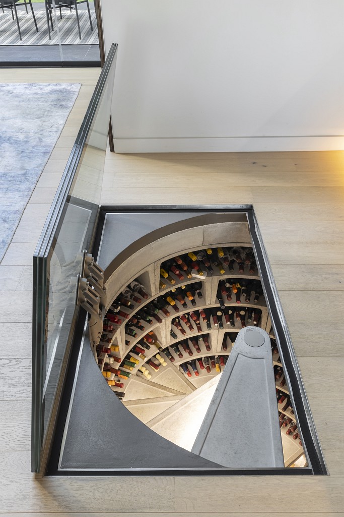 the stair was replaced to match the entrance stair + a new bar sideboard with a wine cooler built adjacent to the sprial cellar.