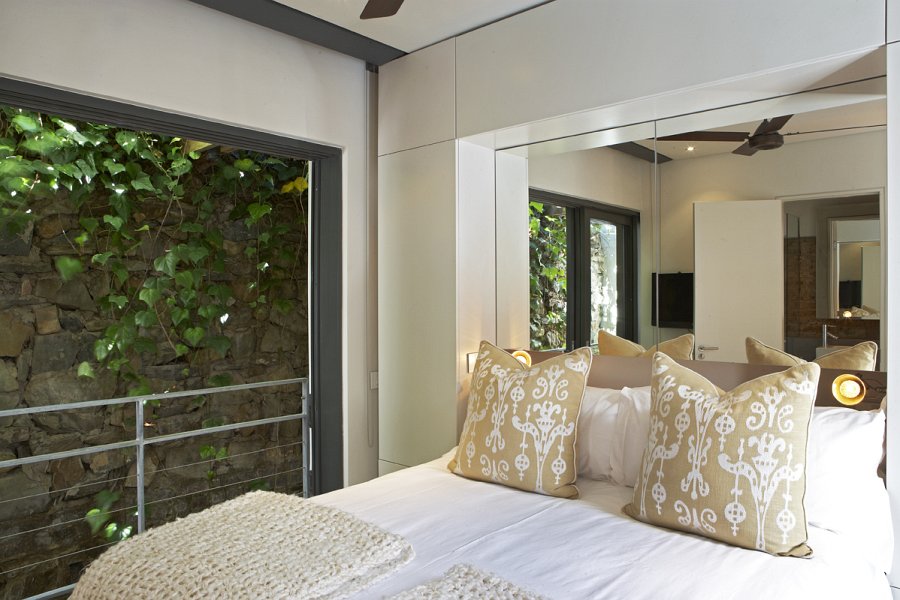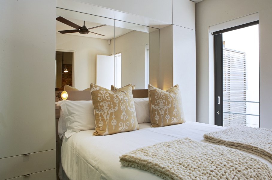 additional storage is inside the lower headboard behind the pillows + bookshelves with mirrored doors above. the slot between acts as a bedside table with lighting + power sockets. the middle top cupboards have doors on pistons hiding the airconditioning