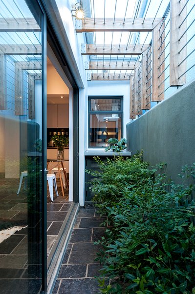 the tiny court links kitchen, dining, liiving + bedroom, bringing light, air + greenery.